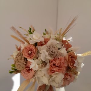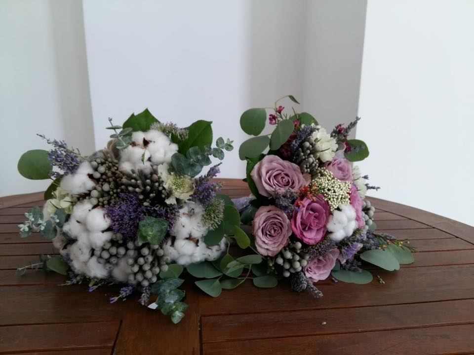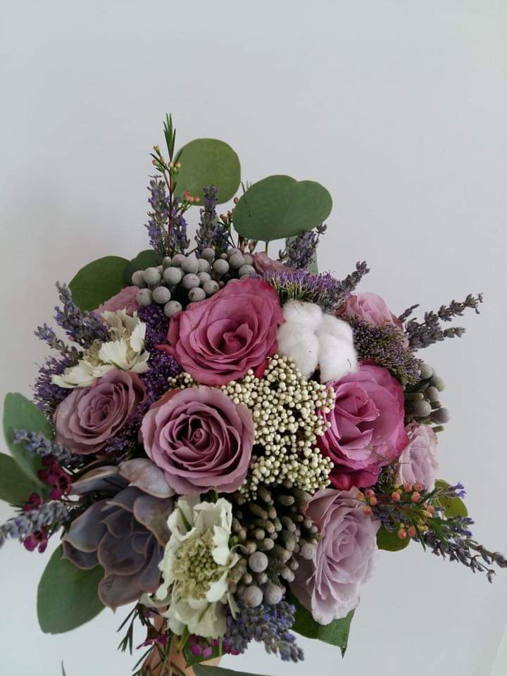 Trandafiri, freesia, liathris, bumbac, lavanda, brunia si verdeata.